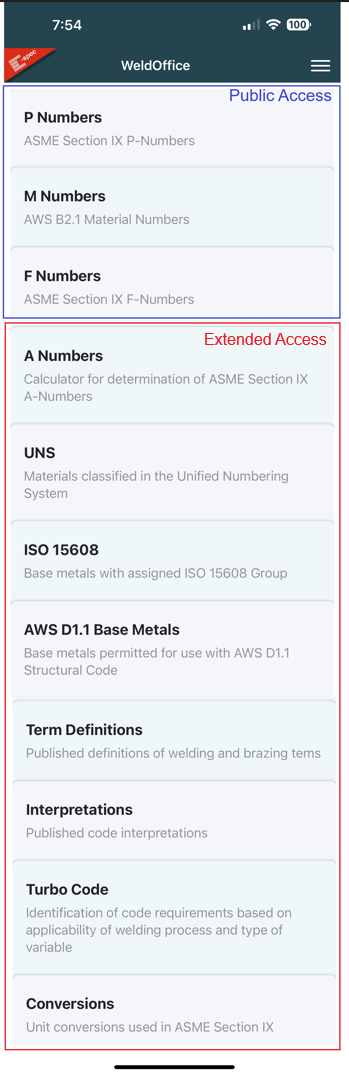 Additional features are available free of charge for professionals who already use WeldOffice desktop software. These extended features can be unlocked by logging in with an authorized account. If you are a licensed WeldOffice software user, contact us to request mobile access.
